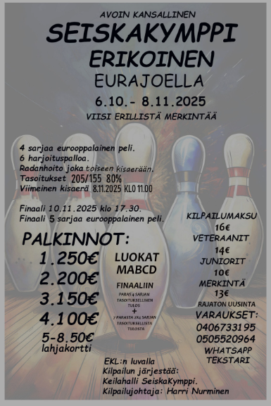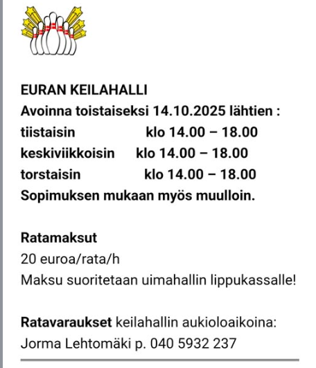 Euran urheilutalo pitää keilahallia toistaiseksi. Maksut suoritetaan Euran urheilutalon lippukassalle. Yrittäjä keilahalliin on edelleen hakusessa.