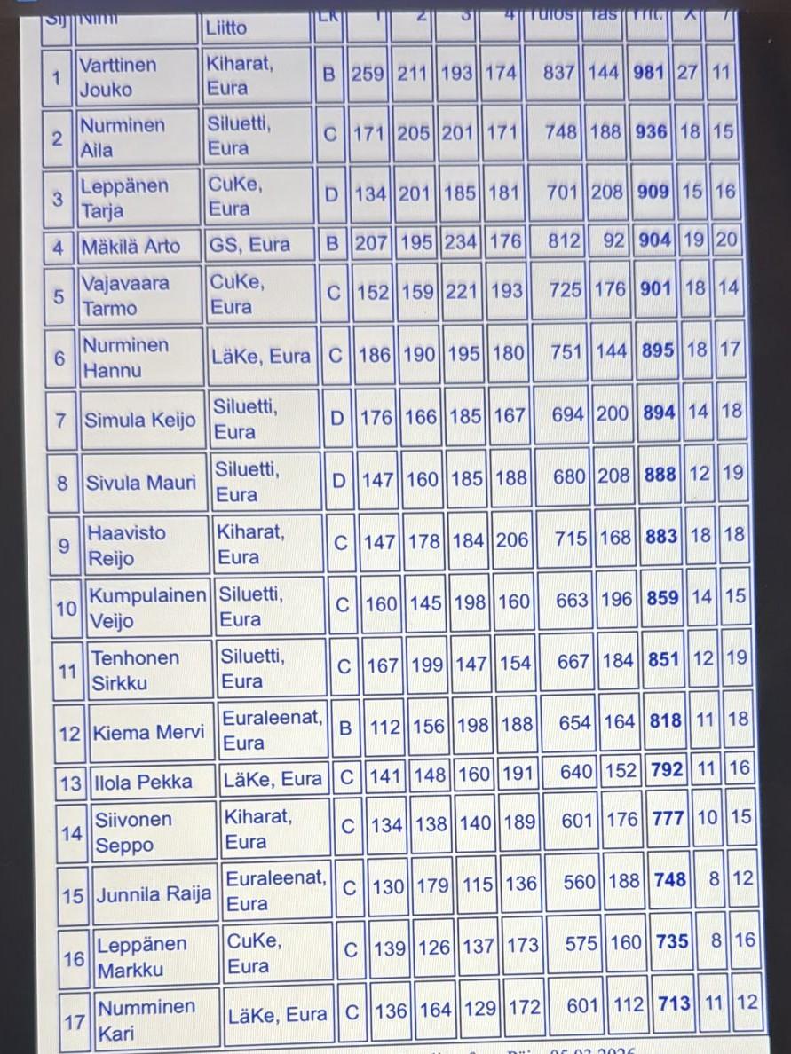Tasoituksellinen tulos Pisteet Puhdas tulos 1. Nurminen Aila 863 8 659 2. Leppänen Tarja 845 6 641 3. Iltanen Kari 843 5 747 4. Vajavaara Tarmo 838 4 642 5. Hurnanen Anneli 834 3 618 6. Jauhiainen…